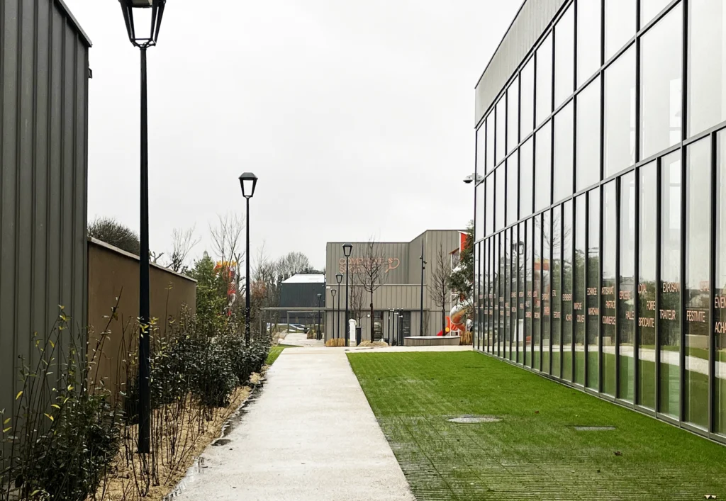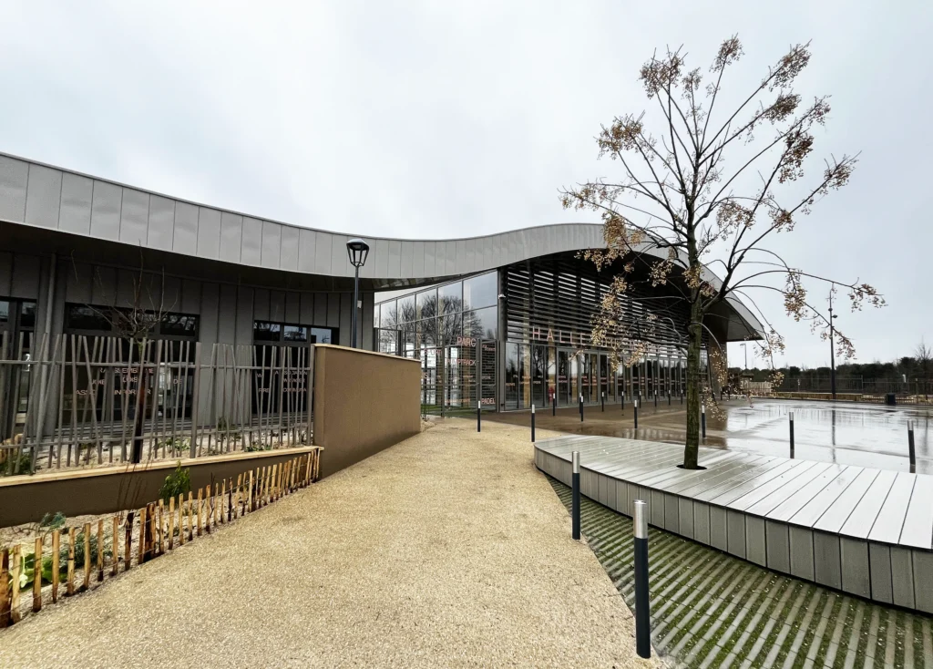 Les bâtiments entièrement réalisés en construction bois sont accompagnés d’un parc paysagé et d’un large parvis permettant des manifestations extérieures. Cet ensemble est pensé pour favoriser le lien social entre les habitants.