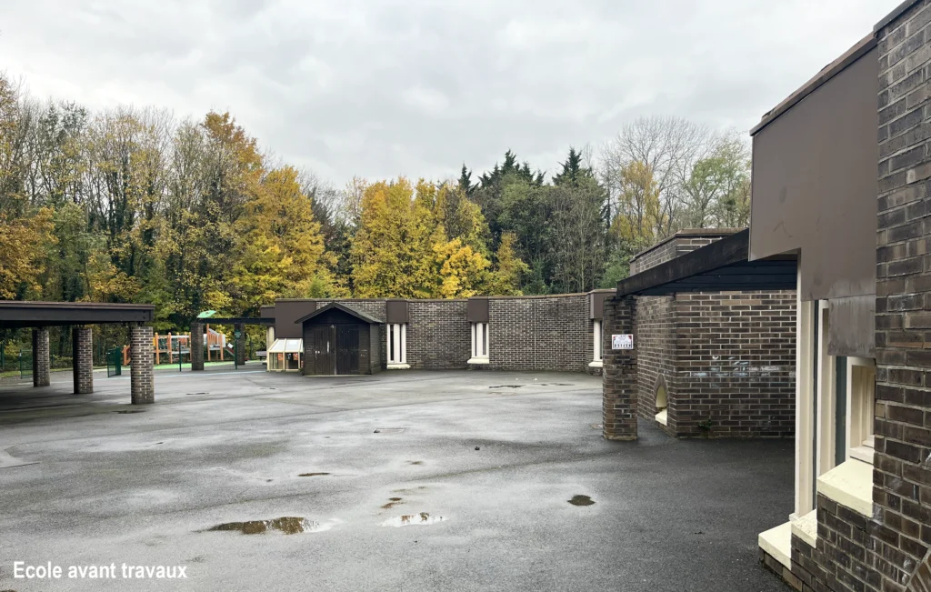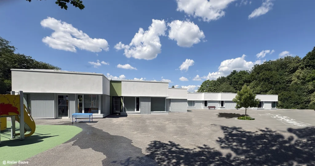 L’école Maternelle et la restauration scolaire Alfred Chartier, construites en 1984 selon les normes de l’époque étaient devenues trop énergivores. De plus, les espaces créés à l’époque ne permettaient plus un service aux normes actuelles. De gros travaux ont donc été réalisés pour permettre la pérennité de cet ensemble : désamiantage, isolation par l’extérieur, renforcement de l’isolation des toitures, remplacement des menuiseries, mise en place de protections solaires des baies, mises aux normes du chauffage et de la C.T.A., traitement des espaces intérieurs et de la cour, remplacement du préau, mise en place de panneaux photovoltaïques et agrandissement de la restauration scolaire.